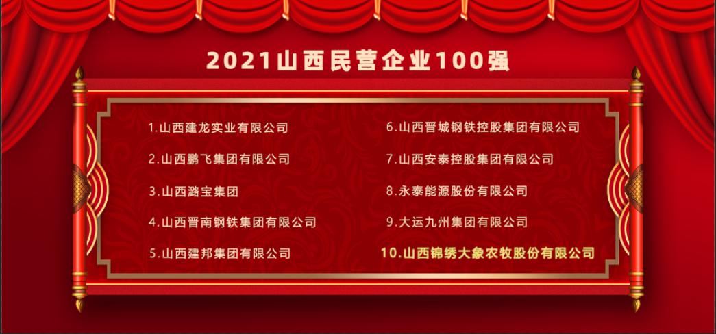 本次在2021山西省民营企业100强中排名第十,是公司自2018年(第十名)、2020年(第九名)后第三次进入全省民营企业百强榜单前十名,是对数万名“大象人”默默奉献、爱岗敬业、苦干实干的激励,充分证明了董事会及高层经营管理团队决策的正确性。未来,公司将紧紧依托省委全方位推进高质量发展和特优战略的政策利好,继续扛起引领全省畜牧业发展的重任,围绕补链延链强链,不断优化产业布局,切实保障好产品供应,为守护三晋父老“菜篮子”安全稳定做出更大贡献。