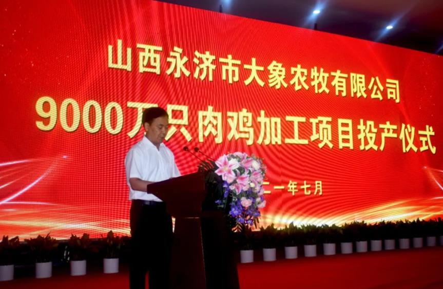 7月的蒲坂大地,树木郁郁葱葱,万物勃发。2021年7月21日,山西永济市大象农牧有限公司9000万只肉鸡加工项目正式投产。运城市副市长董旭光,永济市委书记孙中全,市委副书记、市长黄亚平,市委副书记王文选,市人大常委会主任张立功,副市长卫军、麻亚龙,市政协副主席邵文龙出席仪式。山西博鱼官方网页版_博鱼(中国),农牧股份有限公司董事长吕锐锋,副总裁刘文革及各公司经理人出席。仪式由麻亚龙主持。