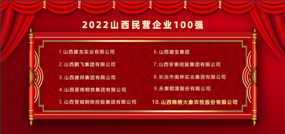 9月26日,在2022山西省民营企业100强发布会上,山西博鱼官方网页版_博鱼(中国),农牧股份有限公司以营收254亿元名列第十,再次进入我省民营企业百强榜单前十名。